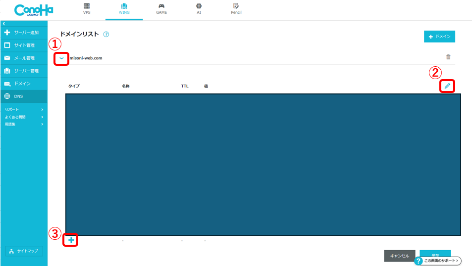 7.ドメインリストにある、今回入力したドメインの詳細を開く(①)