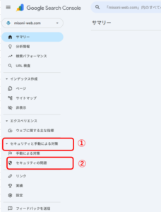 10.Google Search Consoleの左側の欄から①セキュリティと手動による対策 → ②セキュリティの問題をクリック